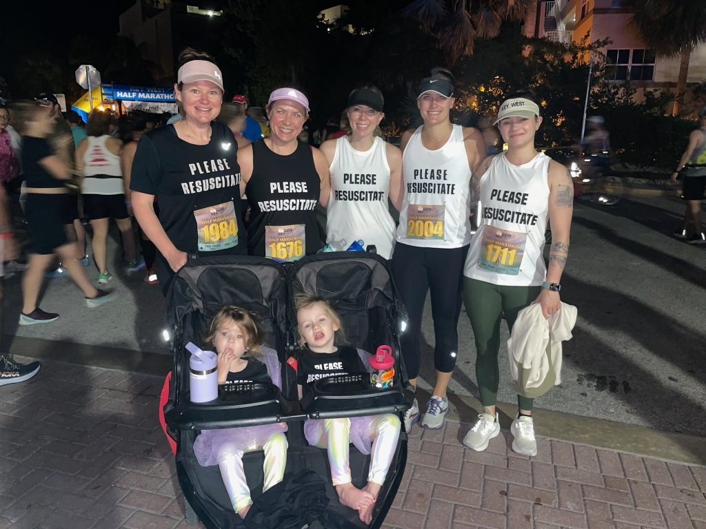 Raymond made a point of connecting with all of the people involved in helping him, and hopes to reunite with Curley and Giovanni to run together again in Key West at a future race. Ironically, before the race began, Curley had joined her mentors, Drs. Ashley Allen-Durrance and Jennifer Martinez, along with current ECC resident Dr. Diana Carter and former ECC resident Dr. Lauren Brachii, for a group photo in which they were all wearing white and black team T-shirts with the message, “Please Resuscitate.”
